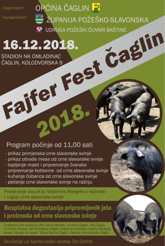 U nedjelju 16. prosinca 2018.godine Općina Čaglin organizira manifestaciju pod nazivom “Fajfer Fest”. Program počinje u 11 sati na stadionu NK Omladinac. Očekuju vas prikazi običaja vezani uz crnu slavonsku svinju, prigodno predavanje, vrhunska gastro ponuda, besplatne degustacije, odlična tamburaška glazba….